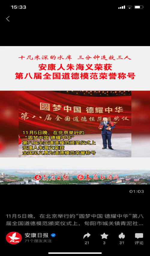 安康日報微信視頻號發(fā)布“第八屆全國道德模范朱海義”