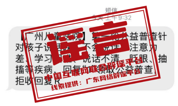 真相:近期,有社會(huì)醫(yī)療機(jī)構(gòu)冒用廣州市婦女兒童醫(yī)療中心(以下簡(jiǎn)稱“廣州婦兒中心”)名稱,通過群發(fā)短信的方式,宣傳該中心正在進(jìn)行“身高普查”“針對(duì)孩子說話晚,不會(huì)說話、注意力差等”等公益普查項(xiàng)目。對(duì)此,廣州婦兒中心發(fā)布聲明稱,目前,該中心未就上述公益普查項(xiàng)目與其他任何醫(yī)療機(jī)構(gòu)或社會(huì)組織存在合作關(guān)系,也未曾通過短信、電話向廣大患者推送過醫(yī)療信息。特此提醒廣大市民,切勿輕信此類信息,并注意保護(hù)個(gè)人隱私。(來源:廣東省互聯(lián)網(wǎng)舉報(bào)中心)