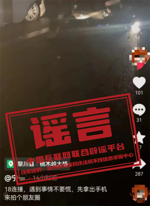 真相:近日,有網(wǎng)民在某網(wǎng)絡平臺發(fā)布“江西黎川境內(nèi)福銀高速贛閩交界處發(fā)生一起18車連撞重大交通事故”的視頻。經(jīng)向?qū)俚馗咚俳痪藢,黎川高速路段并未發(fā)生18車連撞事故,該視頻信息系謠言。目前,警方已依法對散布網(wǎng)絡謠言視頻者予以行政處罰,并責令其刪除相關不實視頻。(來源:“撫州網(wǎng)警”微信公眾號)