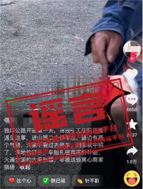 真相:據新疆文化和旅游廳官方微信公眾號消息,獨庫公路已于6月1日10時正式通車。近日,網傳一則“獨庫公路亂撒釘子,商家補胎賺錢”的視頻內容,引發(fā)網民關注。經新疆烏蘇市公安局調查核實,視頻反映的事發(fā)地處于獨庫公路K599路段,為保障通行安全,公路有關部門已對該路段進行巖壁防護網加固工作。視頻中現場釘子來源為施工方拆卸固定模具板材時散落的舊釘子,且根據現場排查,周邊并無汽車輪胎維修點位。視頻發(fā)布者的車胎并未被釘子扎破,亦不存在高額補胎的情況。(來源:“新疆網絡辟謠”微信公眾號)