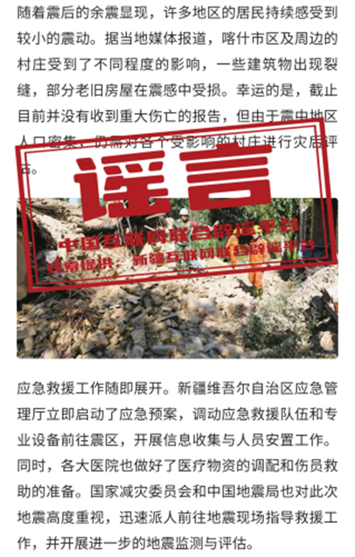 真相:近日,有網民發(fā)布帖文稱“新疆喀什市7月22日發(fā)生6.3級地震,周邊村莊建筑出現裂痕,部分老舊房屋在震感中受損……”。經新疆喀什市應急管理局證實,當日喀什市域內未發(fā)生地震,中國地震臺網也未發(fā)布喀什當日發(fā)生地震的相關信息,此信息為虛假內容。(來源:網信新疆、新疆喀什網絡舉報)