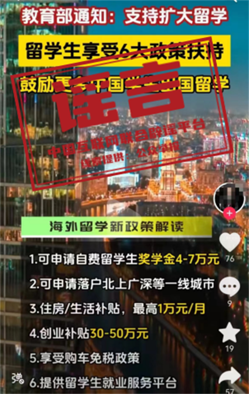 詳情:近日,有自媒體在多個(gè)網(wǎng)絡(luò)平臺(tái)發(fā)布視頻,稱“教育部留學(xué)中心召開發(fā)布會(huì)宣布‘將擴(kuò)大支持留學(xué),留學(xué)生將享受申請(qǐng)自費(fèi)留學(xué)獎(jiǎng)學(xué)金、申請(qǐng)落戶一線城市等六大政策扶持’等留學(xué)新政策”。對(duì)此,教育部留學(xué)服務(wù)中心7月29日鄭重聲明:該視頻虛假不實(shí),我中心從未召開此發(fā)布會(huì),從未發(fā)布過相關(guān)政策。所謂六大政策支持,主要是對(duì)部分地方有關(guān)政策的拼湊和夸大。請(qǐng)廣大留學(xué)生及公眾提高警惕,謹(jǐn)防上當(dāng)受騙。對(duì)此類造謠炒作行為,我中心保留追究相關(guān)方法律責(zé)任的權(quán)利。(來源:“教育部留學(xué)服務(wù)中心”微信公眾號(hào))