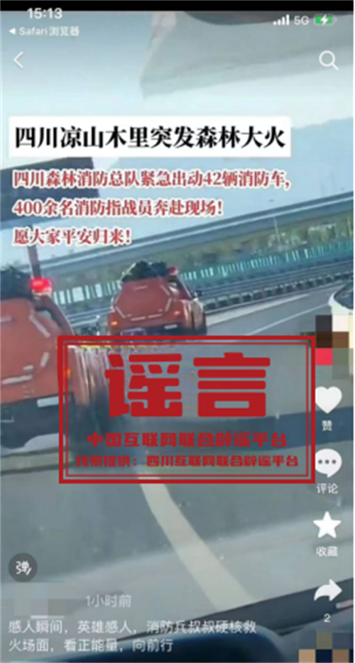 真相:近日,有網(wǎng)民在短視頻平臺(tái)上發(fā)布視頻,并配以“四川涼山木里突發(fā)森林大火,四川森林消防總隊(duì)緊急出動(dòng)42輛消防車,400余名消防指戰(zhàn)員奔赴現(xiàn)場(chǎng)”的文字。當(dāng)?shù)鼐W(wǎng)信部門聯(lián)動(dòng)應(yīng)急管理局進(jìn)行查核,證實(shí)四川涼山木里近日未發(fā)生森林大火。(來源:四川互聯(lián)網(wǎng)舉報(bào)辟謠平臺(tái))