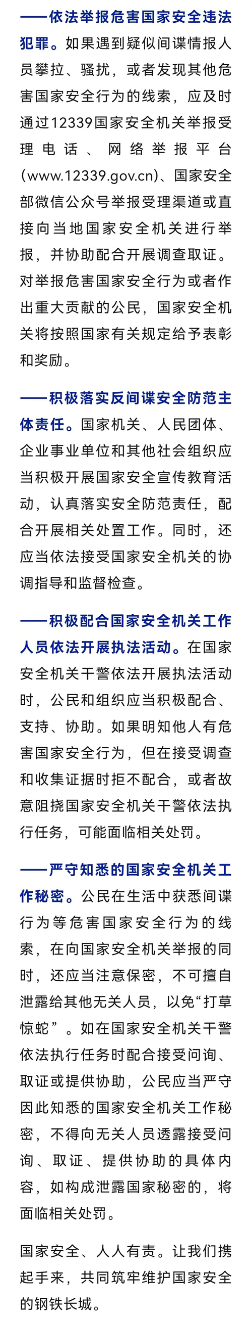 詳情:近年來,國(guó)家安全機(jī)關(guān)在人民群眾支持配合下,有力開展各項(xiàng)工作,堅(jiān)決維護(hù)國(guó)家主權(quán)、安全、發(fā)展利益!吨腥A人民共和國(guó)反間諜法》和《國(guó)家安全機(jī)關(guān)行政執(zhí)法程序規(guī)定》、《國(guó)家安全機(jī)關(guān)辦理刑事案件程序規(guī)定》等法律法規(guī)規(guī)章為人民群眾配合協(xié)助開展國(guó)家安全機(jī)關(guān)工作、共同維護(hù)國(guó)家安全提供了法律依據(jù)。(來源:“國(guó)家安全部”微信公眾號(hào))