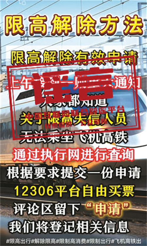 真相:近日,一些短視頻平臺(tái)頻現(xiàn)所謂“限高令新政”信息,宣稱“有內(nèi)部途徑,被限制高消費(fèi)人員不用還款也能正常買機(jī)票、高鐵票”,引發(fā)關(guān)注。對(duì)此,最高人民法院執(zhí)行局相關(guān)負(fù)責(zé)人表示,關(guān)于“新政”一說(shuō)實(shí)屬謠言。各級(jí)人民法院從未出臺(tái)過(guò)解除限制消費(fèi)措施,或?yàn)椴粌斶債務(wù)的限高人員提供長(zhǎng)期“解限”的相關(guān)規(guī)定。網(wǎng)上關(guān)于對(duì)不履行生效法律文書(shū)確定義務(wù)的被執(zhí)行人解除限制消費(fèi)措施等內(nèi)容均為不實(shí)信息。(來(lái)源:北京青年報(bào))