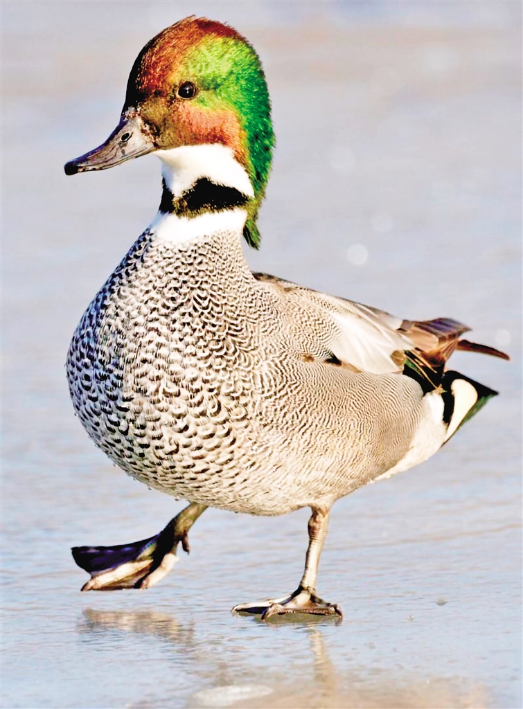 又名葭鳧、鐮刀鴨、扁頭鴨、早鴨、三鴨。雄鳥頭頂至后頸栗色,頭側(cè)及冠羽銅綠色;前頸基部有一黑色領(lǐng)環(huán),上體淺灰色,密布暗褐色波狀細紋;翼鏡綠黑色,三級飛羽延長呈鐮狀;胸黑色密布白色新月形斑,尾下覆羽絨黑色;兩側(cè)具乳黃色斑塊,腋下白色;雌鳥體羽多黑褐色而具黃褐色羽緣,形成明顯的“V”形斑;虹膜褐色,嘴黑灰色,腳暗灰色。因胸、腹、脅部密布由大漸小的黑白波紋,排列成有序的特異圖案,形似編織物而故名。eeu安康新聞網(wǎng)