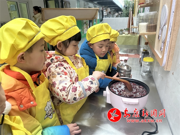 ▲ 石泉縣第二幼兒園開展“童心知民俗 開心過臘八”主題活動,孩子們慢慢熬制香甜可口的臘八粥,將傳統(tǒng)文化與勞動教育相融合。陳遠熙 攝