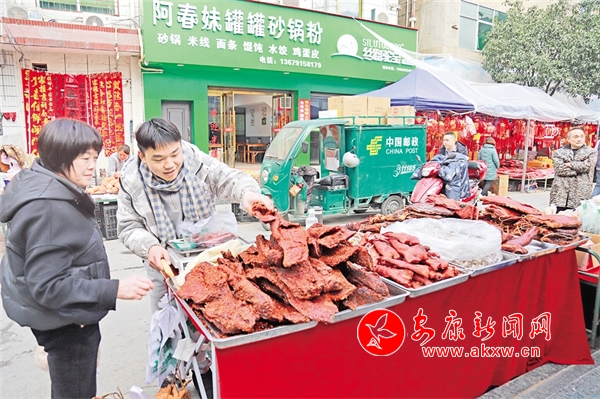 在嵐皋縣城興隆街、建設(shè)路農(nóng)貿(mào)市場,臘肉、香腸、臘排骨、臘豬蹄、血豆腐等等紛紛亮相,為市民提供了豐富的年貨。廖霖 攝