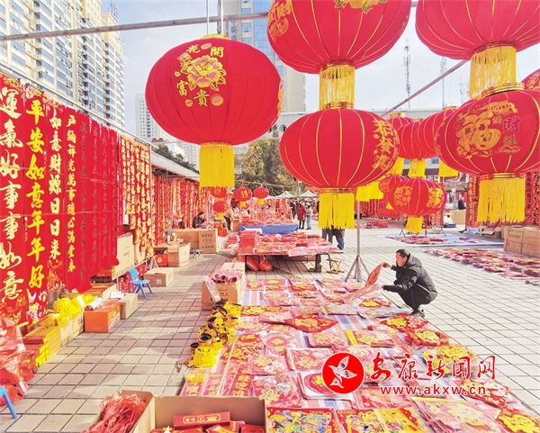 商販在中心廣場售賣春聯(lián)、福字、紅燈籠等節(jié)慶用品。吳定國 攝