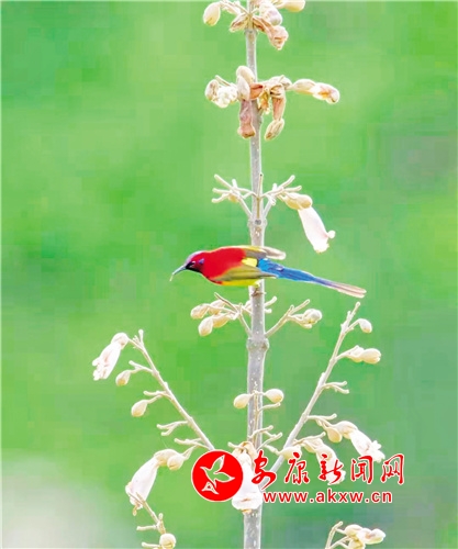 桐花鳳,是經(jīng)常出現(xiàn)在古代文人墨客筆下的吉祥鳥。但因很多人從未見過桐花鳳,遂將桐花鳳與綠毛幺鳳等混淆起來。經(jīng)今人翔實(shí)考證,才證實(shí)古“桐花鳳”就是現(xiàn)今的“太陽鳥”。太陽鳥象征著祥瑞、吉祥和諧、鳳凰齊飛、太陽重升、身化火焰而使人間恢復(fù)光明。它還是熱愛光明、追求光明、獻(xiàn)身光明的象征。太陽鳥也是太陽崇拜和鳥崇拜相結(jié)合的產(chǎn)物。太陽鳥世界共有14種,中國有6種,被譽(yù)為“東方的蜂鳥”“月下老人”,再加上太陽鳥的寓意如此之好,太陽鳥一直受到人們的喜愛與青睞。(圖文 張東風(fēng) )