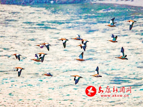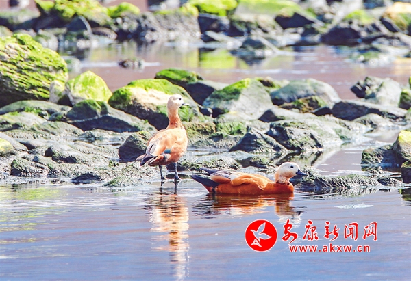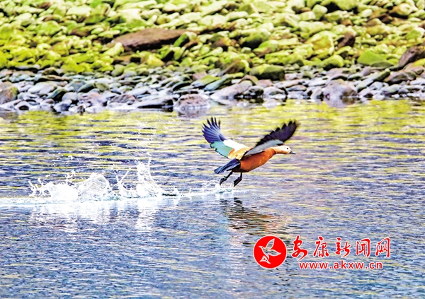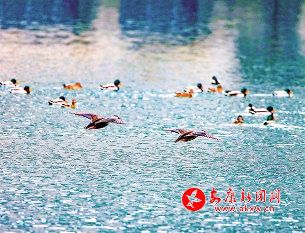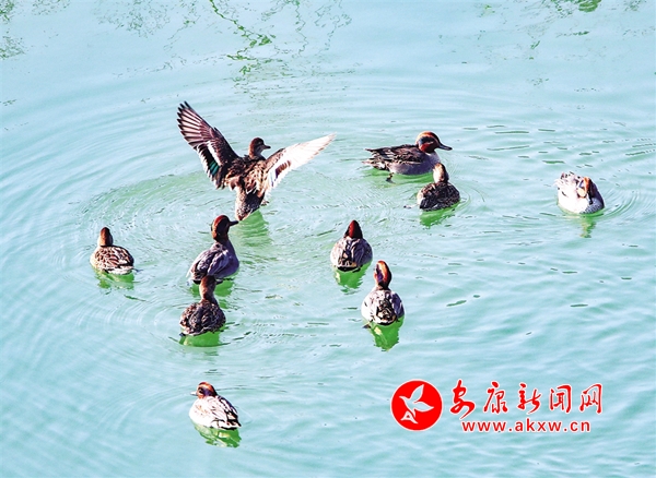 通過攝影鏡頭觀察發(fā)現(xiàn),在大片野鴨群中有綠頭鴨、斑嘴鴨、赤麻鴨等數(shù)10個(gè)種類。它們在這里和諧相處,像一個(gè)個(gè)小精靈悠閑自得。一群群野鴨在河里時(shí)而相互追逐,時(shí)而潛水覓食,一會兒游上岸邊休息,一會兒展翅飛翔劃過湛藍(lán)的天空,一幅人與自然和諧共生的美麗畫卷在石泉徐徐展開。