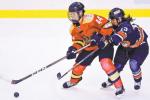 12月10日,深圳昆侖鴻星隊球員(左)和深圳萬科陽光隊球員在CWHL(加拿大女子冰球聯(lián)賽)常規(guī)賽比賽中拼搶……