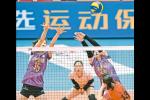 11月28日,天津女排球員王媛媛(左一)和陳麗怡(右上)在比賽中……