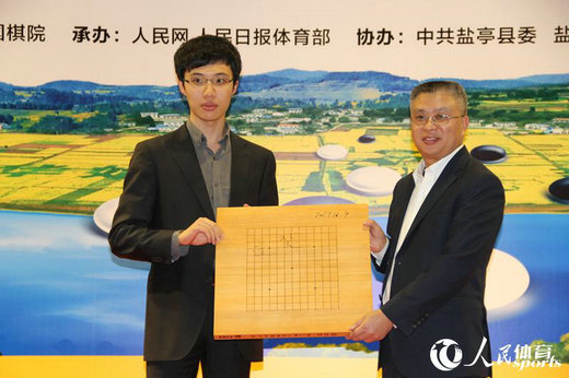 現(xiàn)任“名人”連笑向袁明贈送簽名棋盤