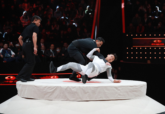 比賽現(xiàn)場,絢麗的燈光效果、動感的背景音樂,360度大屏幕,讓高1.5米、直徑3米的擂臺非常炫酷,處處展現(xiàn)著傳統(tǒng)與現(xiàn)代的創(chuàng)新融合。揭幕戰(zhàn)中,10名功守道運(yùn)動員進(jìn)行5場正式較量,每場三個回合決出勝負(fù)。