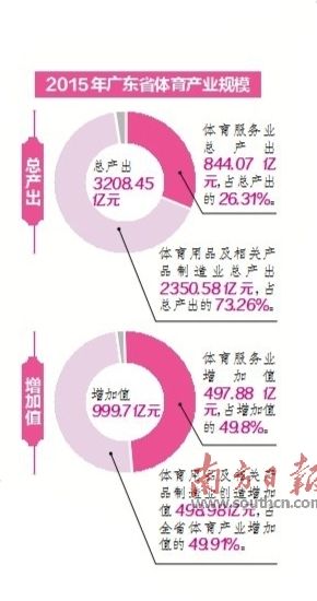 據(jù)最新統(tǒng)計(jì)數(shù)據(jù)顯示,2015年廣東省體育產(chǎn)業(yè)總產(chǎn)出3208.45億元,增加值999.7億元,占我省2015年GDP的1.37%,總產(chǎn)出約占全國體育產(chǎn)業(yè)的18.19%。其中體育用品及相關(guān)產(chǎn)品制造業(yè)在我省體育產(chǎn)業(yè)總產(chǎn)出與增加值中占比最高。體彩銷量穩(wěn)步提高,近五年來共銷售719.37億元,籌集公益金178.26億元,居全國前列。