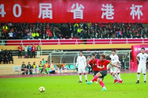 “省港杯四十年情懷不變,東較場(chǎng)逾百年再寫(xiě)輝煌”,昨日超過(guò)八千球迷涌進(jìn)省體育場(chǎng)觀戰(zhàn)。相比起首回合廣東隊(duì)派上多名年輕隊(duì)員上陣,昨日廣東隊(duì)首發(fā)的班底以老將為主,廣州足球旗幟人物盧琳歸隊(duì)并擔(dān)任隊(duì)長(zhǎng)。由于首回合中國(guó)香港隊(duì)取得2粒進(jìn)球,因此次回合祭出“鐵桶陣”嚴(yán)防,上半場(chǎng)廣東隊(duì)久攻不下,直到第40分鐘,盧琳帶球進(jìn)入禁區(qū)被對(duì)方防守球員鏟倒,裁判判罰點(diǎn)球,盧琳親自主罰命中,這是盧琳第12次參加省港杯打進(jìn)的第8粒進(jìn)球。