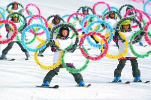 1月21日,“2018世界雪日暨國際兒童滑雪節(jié)”活動拉開帷幕。圖為在北京延慶舉行的開幕活動上,幾十位小朋友手持奧運(yùn)五環(huán)標(biāo)志在滑雪教練帶領(lǐng)下滑雪。 新華社記者 鞠煥宗攝