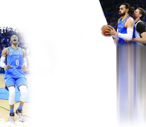 擁有三巨頭的雷霆,依靠威少的個(gè)人發(fā)揮拿下比賽。大加索爾(右)此役復(fù)出與亞當(dāng)斯對(duì)位。