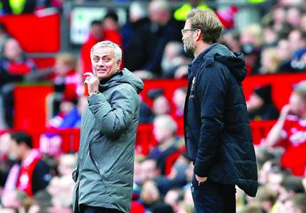 穆里尼奧(左)與利物浦隊主教練克洛普在場邊交流 /新華社