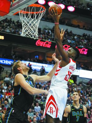 火箭隊(duì)球員卡培拉(上)在比賽中上籃! ⌒氯A社/美聯(lián)