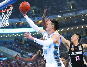 北京首鋼隊球員翟曉川(前)在比賽中上籃。 新華社記者 孟永民攝