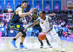 新疆隊(duì)球員亞當(dāng)斯(右一)在與廣東隊(duì)比賽中運(yùn)球突破。 新華社記者 王 菲攝
