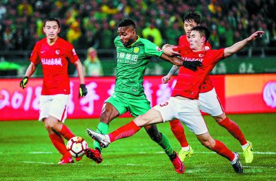中赫國安隊(duì)外援巴坎布(左二)在比賽中帶球突破。本報(bào)記者 潘之望攝