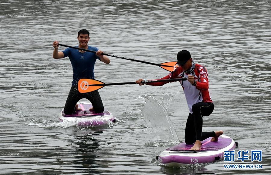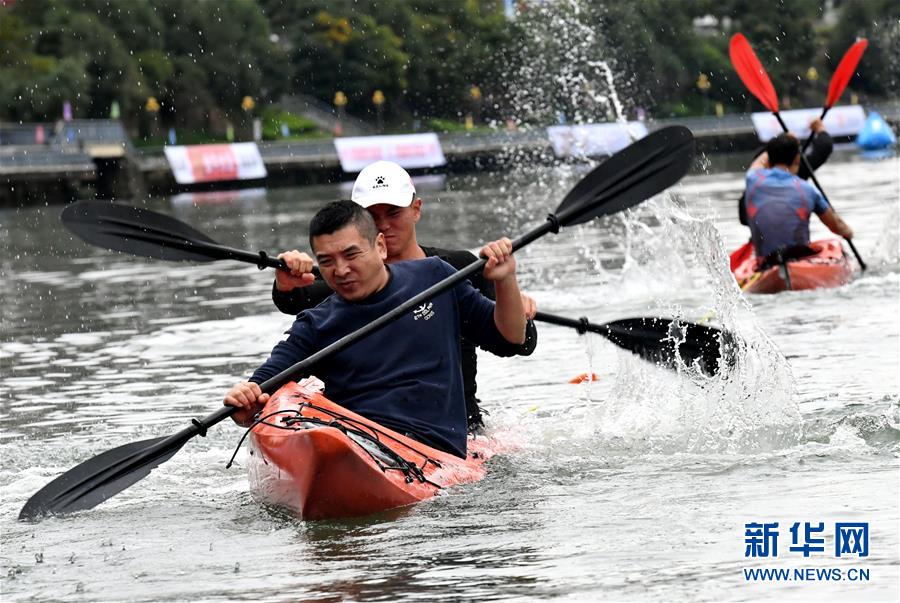 ↑11月16日,皮劃艇拔河賽選手在比賽中。 當(dāng)日,2018年福建將樂皮劃艇趣味賽在將樂縣金溪河開賽。本次比賽設(shè)皮劃艇拔河、皮劃艇接力、槳板競渡3個(gè)項(xiàng)目,吸引了福建、吉林等國內(nèi)120名選手參與。 新華社記者彭張青攝