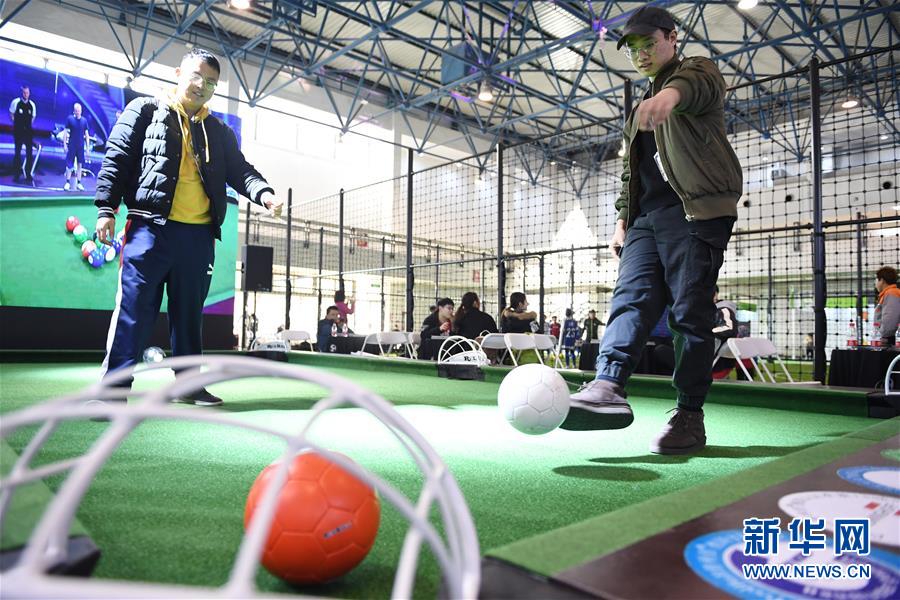 兩位參觀者在體驗(yàn)臺式足球。 新華社記者鞠煥宗攝