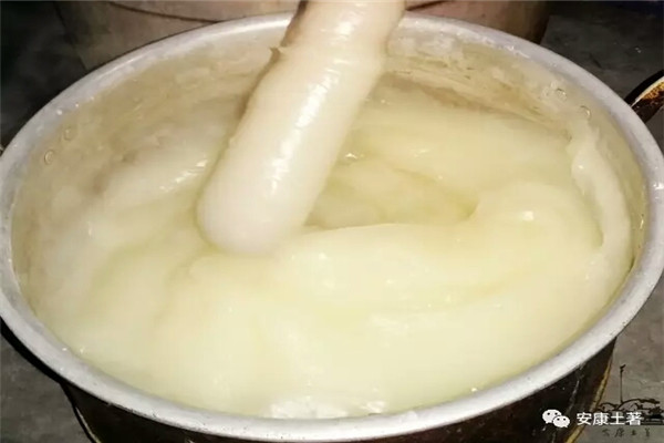 做面魚講究的是熬煮,粉/面下鍋置于煤爐上,用沸水加入不斷攪拌,使粉/面均勻沾水受熱,期間要不停用搟面杖攪拌,要保證粉/面漿煮熟還不粘鍋燒糊,攪拌的力度和方向就全靠多年積累的經(jīng)驗(yàn)。熬煮成熟的包谷面漿,稀稠得恰當(dāng)好處,過(guò)稀掉在鍋里難以成形,過(guò)稠壓制過(guò)程就格外費(fèi)勁。反復(fù)加沸水三次并充分?jǐn)嚢鑴騼艉,沸水才能把?面煮熟。