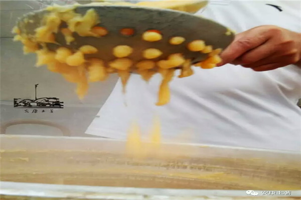 做面魚兒用的工具是漏勺,最早是用大葫蘆切兩半所做的葫蘆瓢,用燒紅的火鉆鉆出一個(gè)個(gè)的小洞,后來(lái)有了鋁制漏勺就很少有人再用葫蘆瓢了。