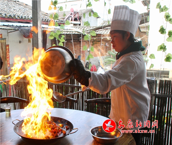 許苗苗是“好友之家”的三個(gè)合伙人之一,是個(gè)快人快語的女老板,她麻利地穿上白色大廚褂子,拿著一個(gè)從貴州定制的鐵鍋在手中掂了掂,迅速放在桌子上放油加熱,將預(yù)先準(zhǔn)備好的紅綠尖椒倒入鍋中翻炒,隨后將腌制好的雞塊伴著酒倒入鍋中,霎時(shí)間火苗竄出半米高,圍觀的客人們發(fā)出陣陣感嘆。等上幾秒火小了,許老板不慌不忙地用鏟子翻炒大致兩分鐘,香味撲鼻的鐵鍋雞便做好了。許苗苗介紹道:“貴州鐵鍋雞一雞三吃,將一只整雞剔骨,骨頭用來熬粥,帶少許骨頭的雞肉入鐵鍋進(jìn)行第一道加工食用,吃到一半的時(shí)候放入無骨雞肉上鍋燜煮十來分鐘,這樣才能將雞肉帶來的所有味覺體驗(yàn)發(fā)揮到淋漓盡致。”