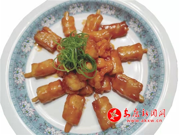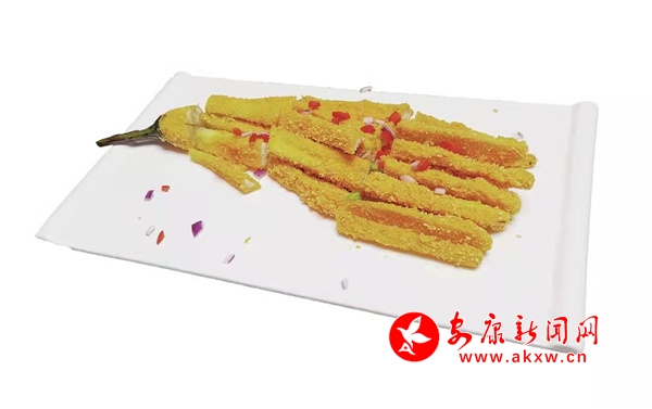 推薦理由:這道菜選用長形的紫氣皮茄子,削皮后橫豎刀切成佛手狀的粗條,均勻給每一根茄條拍上調(diào)味后的干淀粉、抹上雞蛋液,再裹上一層面包糠,下油鍋炸至表皮金黃,切成長短適合入口的大小,點綴上洋蔥碎和辣椒丁便可擺盤上桌了。菜品顏色金黃燦爛,看一眼便讓人食欲大開,夾一塊送入嘴中,外皮酥脆化渣,內(nèi)部是茄肉的軟嫩多汁,茄子的香味透過面包糠的油香層層滲入口腔,余味悠長,是一道老少皆宜的美味佳肴。