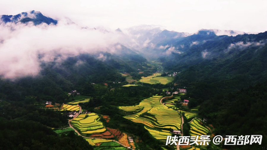 西部網(wǎng)訊(通訊員 彭東雁) 9月13日,霏霏細(xì)雨過(guò)后,世界首次異地野化放飛朱鹮基地——寧陜縣城關(guān)鎮(zhèn)寨溝村,云霧繚繞,青山如黛,層層梯田猶如錦緞,秋色盡顯,美不勝收。59x安康新聞網(wǎng)