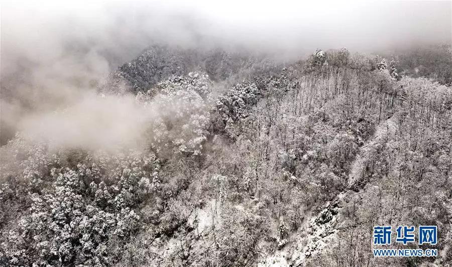 11月8日無人機拍攝的銀裝素裹的鬼谷嶺國家森林公園主峰。 新華社記者陶明攝