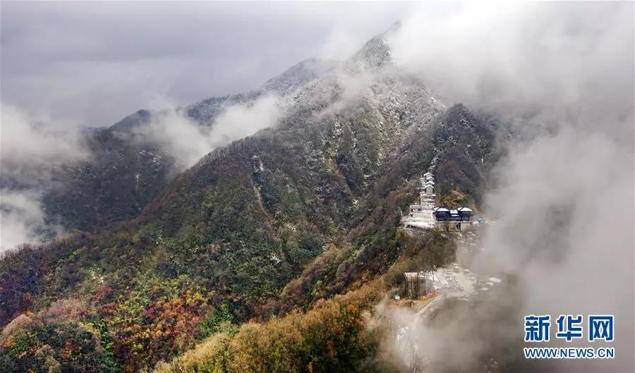 云霧中的鬼谷嶺國(guó)家森林公園山頂白雪皚皚,山腰秋色正濃(11月8日無(wú)人機(jī)拍攝)。 新華社記者陶明攝