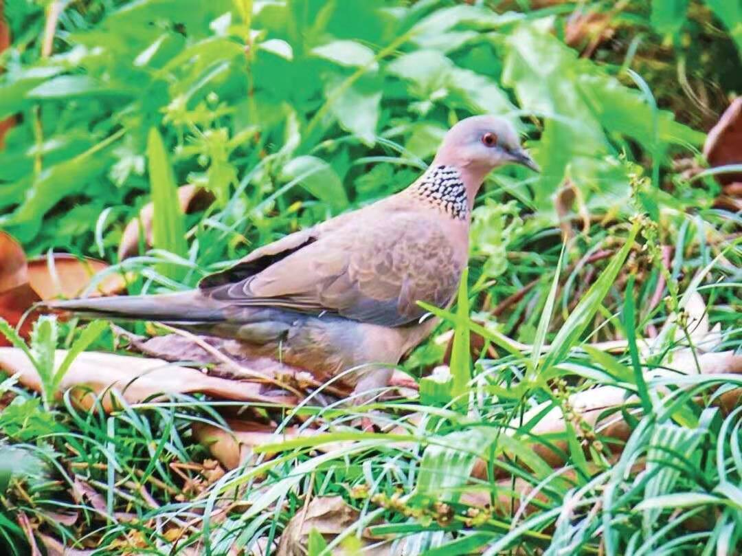 珠頸斑鳩也是很少到地面上來,只有無人時(shí),會(huì)笨拙地飛到在地面上叨食。它們常藏在樹枝間,看不到身影,但會(huì)發(fā)出“咕咕”的聲音,表明自己的存在。
