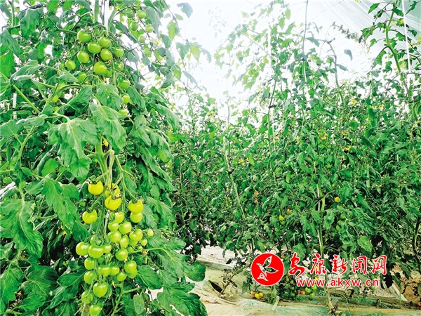 大片綠油油的菜園里,竹條支起的架子上爬滿了藤蔓,隱約可見藤蔓下藏著點(diǎn)點(diǎn)鮮紅,春日的艷陽里,點(diǎn)點(diǎn)紅色在綠葉的掩映下,顯得格外動人,大石嶺的圣女果紅了。