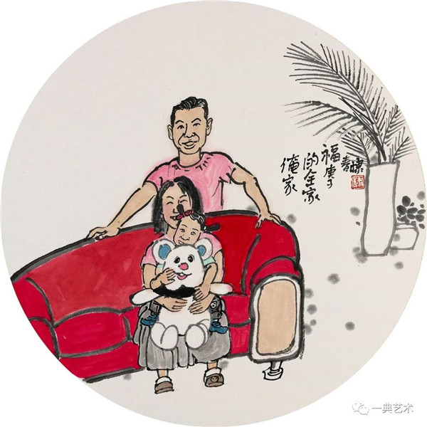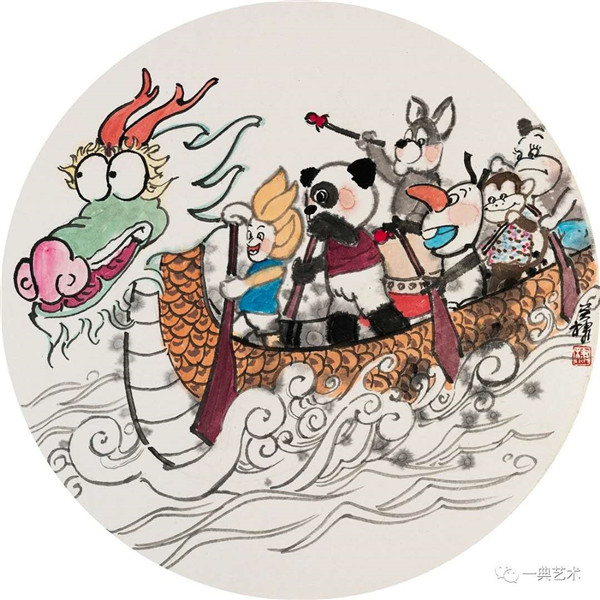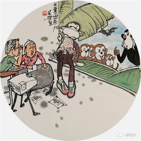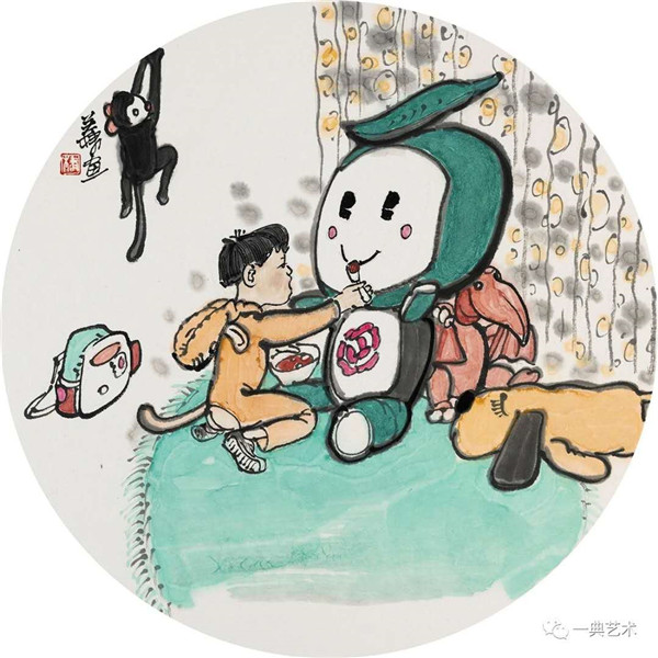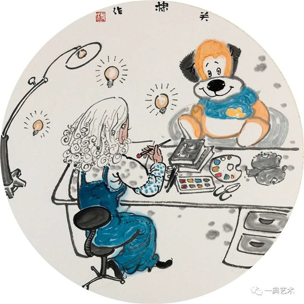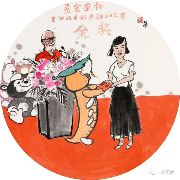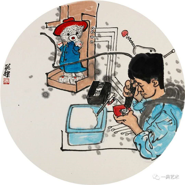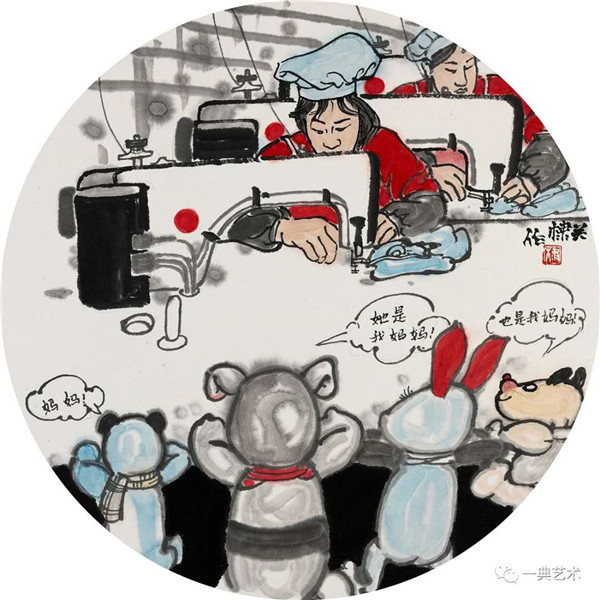 創(chuàng)作這個(gè)題材,我思考的內(nèi)容是豐富的,表達(dá)方式是明晰的,創(chuàng)作沖動(dòng)是豐沛的。在初期,當(dāng)沒有門徑的時(shí)候,曾經(jīng)請(qǐng)人社局根據(jù)文字資料“劃重點(diǎn)”,而人社局領(lǐng)導(dǎo)給了很寬泛的態(tài)度:沒有重點(diǎn),只要和毛絨玩具相關(guān)。這一態(tài)度實(shí)際上解放了我的思想,放開了我的手腳:尋求有約束的自由——給以充分自由——自我追尋“有約束”的自由。好吧,自己給自己尋找方向!考察結(jié)束,創(chuàng)作方向已經(jīng)確定:以人和毛絨玩具作為主要表現(xiàn)內(nèi)容,以中國(guó)水(彩)墨畫為形式。在那幾天(直至今日)我頭腦里充斥著毛絨玩具和女工的形象,兩者形異神同,就像《西游記》中人神共處。因此,創(chuàng)作中我將人和物都以“人”的精神面貌進(jìn)行刻畫,為了藝術(shù)語(yǔ)言的統(tǒng)一,將人略作夸張,并力求“以形寫神”“形神兼?zhèn)?rdquo;,并設(shè)定一定情節(jié)性、趣味性。實(shí)際上毛絨玩具在設(shè)計(jì)過程中,應(yīng)該是運(yùn)用了文學(xué)領(lǐng)域的比喻、比擬、夸張、類比、通感等修辭手法,這也是我在創(chuàng)作中經(jīng)常用到的手法。我是一個(gè)中國(guó)畫家,因此作品強(qiáng)調(diào)中國(guó)畫的意蘊(yùn),任何時(shí)候,不忽略筆墨的表現(xiàn)。為了符合這個(gè)產(chǎn)品的特性(裝飾性、時(shí)尚性),我有意識(shí)吸取了一些水彩畫的表現(xiàn)語(yǔ)言。無(wú)論從思想上、技法上,不脫節(jié)傳統(tǒng)、不疏離當(dāng)代。這種表現(xiàn),(也許)增加了作品的藝術(shù)性。